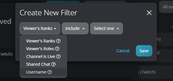 For our tutorial’s sake, we are going to select “Username”, which means the filter will only trigger when a particular chatter messaged for the first time.